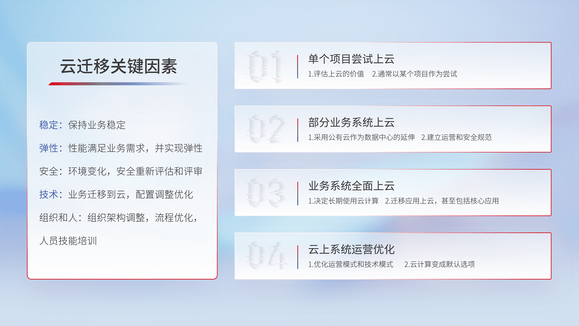 结合实际业务,,,从规划设计、、云平台选型、、云原生改造、、、、数据迁移、、、、集成交付,,迁移全过程为客户识别最佳上云路径,,,,做好风险识别管理,,,设计网络架构、、、身份权限、、、、安全审计合规、、、、操作审计、、、日志审计、、、、监控告警策略、、、、多站点容灾设计等,,对云上基础设施进行整体规划,,提升IT治理水平,,,以满足弹性、、高可用、、、高性能的需求。。。